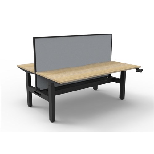 Rapidline Boost back to back 2 person manual crank height adjustable workstation with cable tray and screen. Oak top with black frame. Dimensions: 1500W x 750D x 705 - 1155mmH per user. Overall height including Screen: 1330mmH. Column Size: 90mm x 60mm. Frame Height: 680mm - 1130mm. Max Speed: 15mm per second (10mm per full turn circle). 1500W x 30T x 900mmH pinnable privacy screen finished in grey fabric with matching black powder coated extrusion. Fully ducted cable tray with punchout for power and data to be fitted to either external or internal of frame. HE0 rated 25mm thick table top. Rigid edging and 50mm D Scallop cut out to rear underframe. Adjustable leveling feet. Foot Size: 700mm. Desk Mounting Top Plate Size: 500mm. Steel Gauge: 3.0mm, 2.0mm and 1.5mm used throughout. 10 Year Manufacturer's Warranty. Delivery, installation and assembly charges may apply to furniture. Please enquire to confirm.