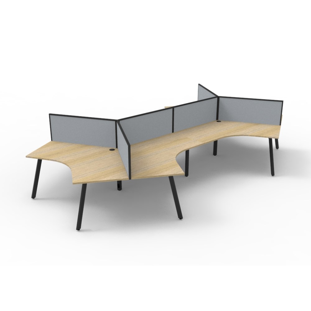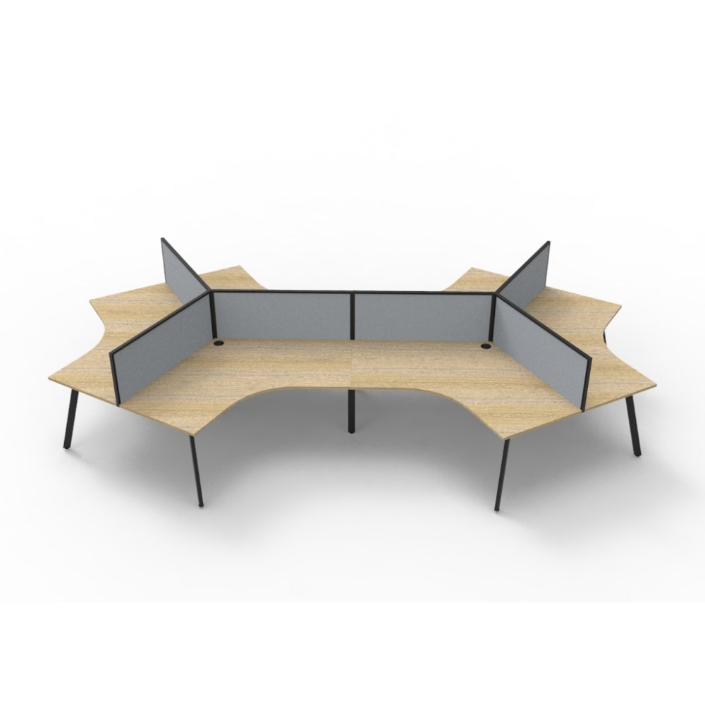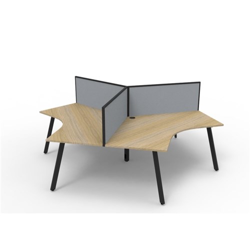 Overall Dimensions Including Screen: 2866W x 2480D x 1200mmH. Dimensions Per User: 1205W x 1205D x 730mmH. 495mm height x 30mm thick pinnable privacy screen upholstered in grey fabric with matching powder coated extrusion and screen. Natural oak worksurface with a 60 x 30mm powder coated black Eternity leg underframe. 30mm cable access void in between double sided users. Infill rail available at additional cost. Dual cross bar for added stability. 1 x 80mm diameter cable entry hole. E0 enviroboard melamine worksurface. Adjustable leveling feet. 5 Year Manufacturer's Warranty. Delivery, installation and assembly charges may apply to furniture. Please enquire to confirm.