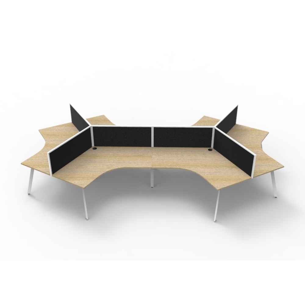 Overall Dimensions Including Screen: 2866W x 2480D x 1200mmH. Dimensions Per User: 1205W x 1205D x 730mmH. 495mm height x 30mm thick pinnable privacy screen upholstered in grey fabric with matching powder coated extrusion and screen. Natural oak worksurface with a 60 x 30mm powder coated white Eternity leg underframe. 30mm cable access void in between double sided users. Infill rail available at additional cost. Dual cross bar for added stability. 1 x 80mm diameter cable entry hole. E0 enviroboard melamine worksurface. Adjustable leveling feet. 5 Year Manufacturer's Warranty. Delivery, installation and assembly charges may apply to furniture. Please enquire to confirm.
