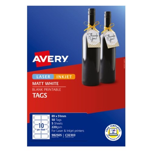 Double-sided printing with room for logo, messaging, pricing or barcode. Print-to-the-edge for a full colour, professional finish. Includes pre-punched holes to add your favourite ribbon or string. Compatible with laser and inkjet printers. Recyclable. Customise your labels with Avery's free and easy-to-use template software.