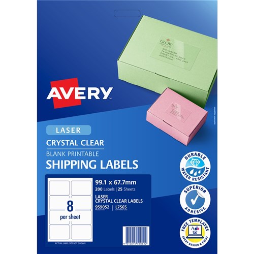 Made from durable material, which is oil, dirt, splash and tear proof. Clear labels virtually disappear when applied to white and coloured surfaces for a printed on look. Jam-Free reliability for trouble free printing, saving time and minimising wastage. Ideal for sending elegant parcels, gifts and boxes. Made in Australia. Size: 99.1x67.7mm 200 labels, 25 sheets. 8 labels per sheet (8UP).