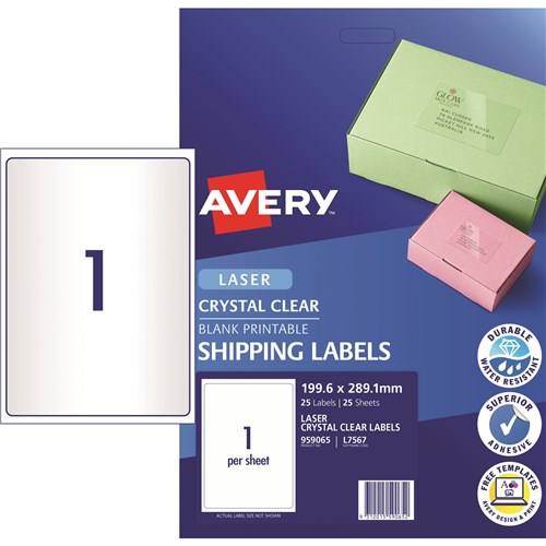 Avery Crystal Clear Laser Shipping Labels White L7567 199.6x289.1mm 1UP 25 Labels