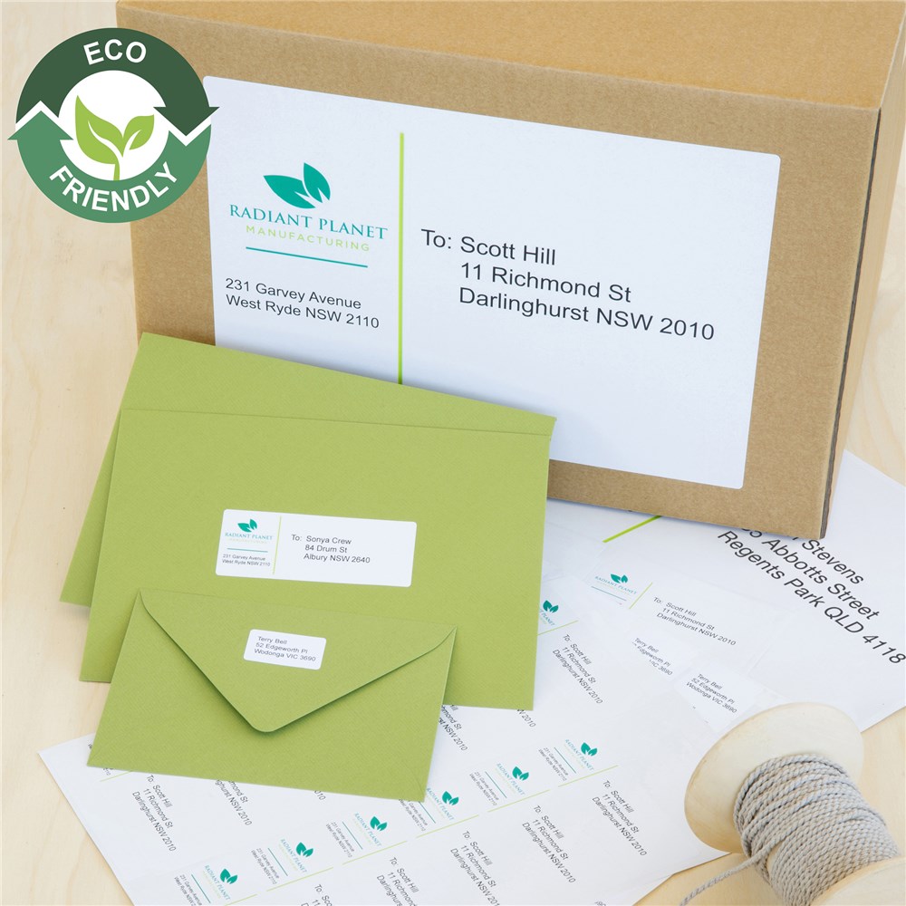 Environmentally friendly recycled material. Labels utilise water soluble eco-friendly adhesive. The packaging and label can be recycled. FSC certified labels made with paper from well-managed forests. This pack has 280 labels in total, 14UP, 20 Sheets.