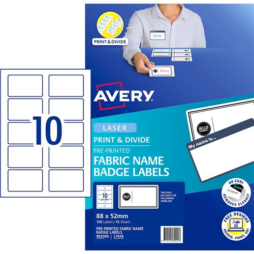 Ideal for seminars, meetings, trade fairs, conferencing, training sessions, schools and childcare centres. Help keep your facility safer by creating name badges on demand for employees and visitors. Made from flexible fabric material with removable adhesive that can be used on most textiles and removed without leaving residue. Customise your name badges with Avery's free and easy-to-use template software. Print and divide feature allows you to tear off, sort and distribute your badges easily. Features an attractive silk like material which moves freely with your clothing and sticks securely without curling or falling off. They are safe for applying to most fabrics and can be removed easily leaving no residue. There are 150 white badges in a pack with 10 badges per sheet in a size of 88 x 52mm and 15 sheets per pack. Format A4. Print as many as you need, when you need them using your laser printer or simply handwrite directly onto the badge. Pre-Printed 'Hello! My name is' white label with black border.