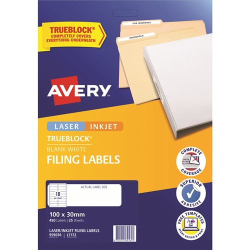 Avery Filing Laser & Inkjet Labels White L7172 100x30mm 18UP 450 Labels 25 Sheets