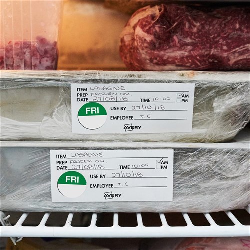 Visually identifies discard date of prepared food. Space to write the date on the label. Ideal for commercial refrigeration and food storage applications. Temperature -5 to +65C. Removable adhesive adheres to a variety of surfaces and removes easily.