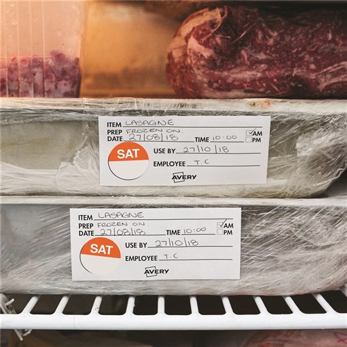 Visually identifies discard date of prepared food. Space to write the date on the label. Ideal for commercial refrigeration and food storage applications. Temperature -5 to +65C. Removable adhesive adheres to a variety of surfaces and removes easily.