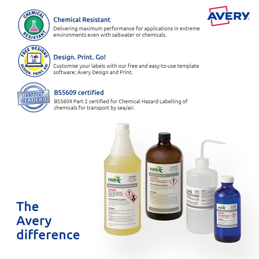 Ultra-Resistant Labels are saltwater resistant and certified for GHS Chemical Labelling with permanent adhesive and engineered to take on harsh environments. Unaffected by temperature variations -40?C to +150?C. Ideal for chemical labelling requirements and for onsite chemical decanting. Used in marine and harsh environments, ideal for safety signs, arc flash and tanks. Customise your labels with Avery Design and Print, available at averyproducts.com.au/print. Size: 210x148mm 20 labels, 10 sheets. 2 labels per sheet (2UP).