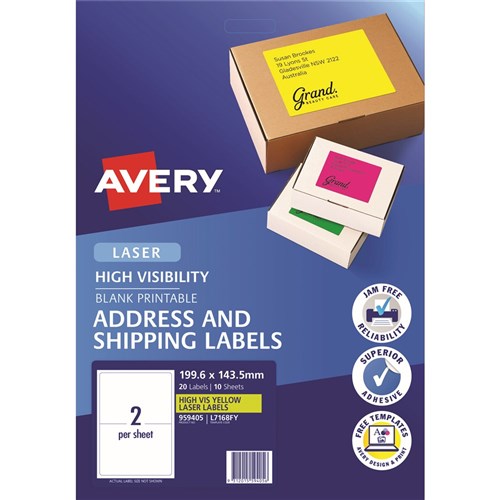 Avery High Visibility Shipping Laser Labels Yellow L7168FY 199.6x143.5mm 2UP 20 Labels