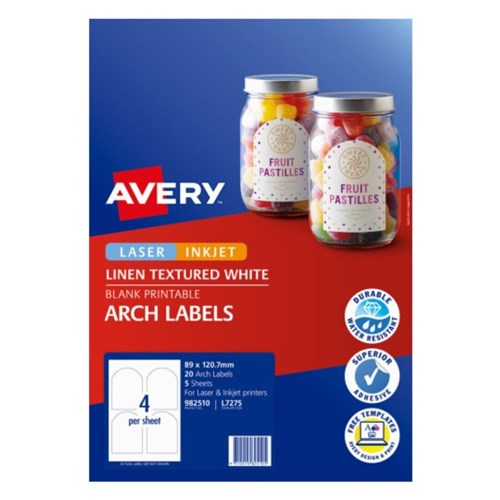 Unique arched labels which also have a premium linen textured surface. Durable waterproof material perfect for creating personalised wine bottles. Print-to-the-edge labels provide a full colour, professional finish. Permanent adhesive sticks to multiple surfaces like glass, metal, paper and plastic. Suitable for use with laser and inkjet printers. FSC certified. Customise your labels with Avery's free and easy-to-use template software.
