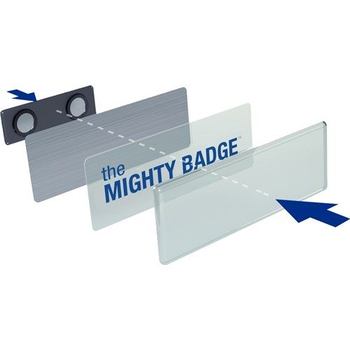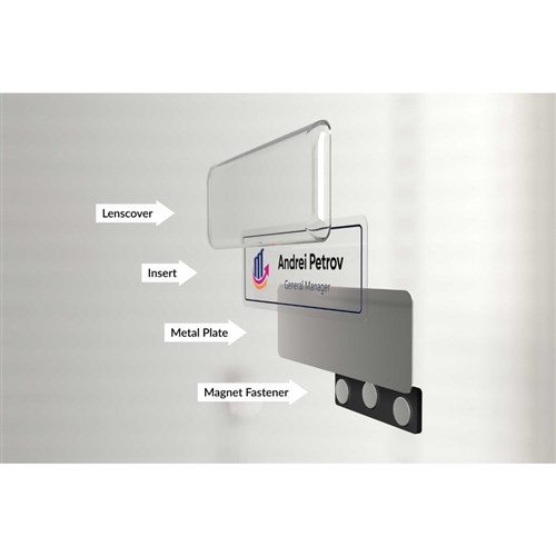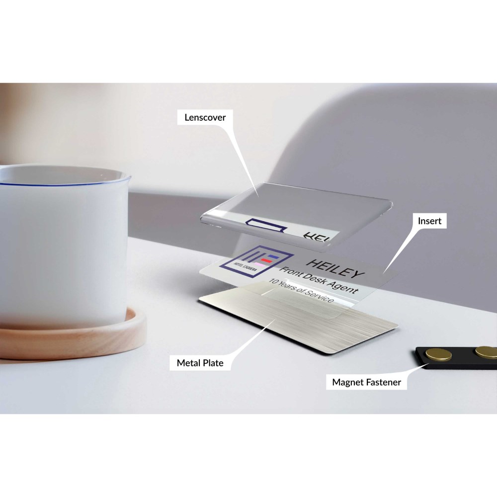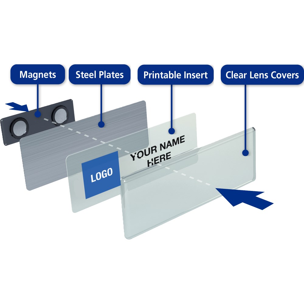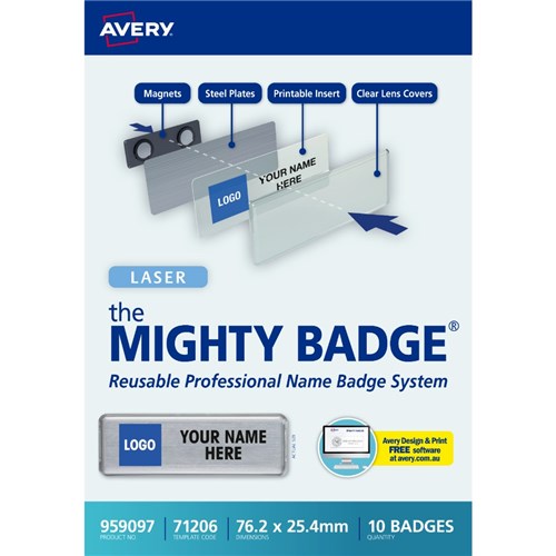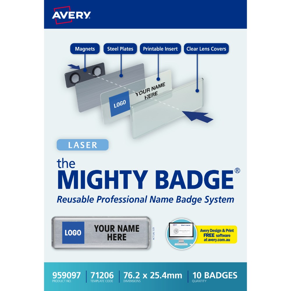 Kit contains 10 silver durable steel plates, 10 shatter-resistant lens covers, 10 strong magnets, 20 clear inserts (1 sheet), 20 bright white paper inserts (1 sheet) and a test sheet. Perfect for a variety of industries such as hospitality, business and health care. Name badges can be used and reused for every occasion by simply replacing inserts. Customise your labels with Avery Design and Print, available at averyproducts.com.au/print. Suitable for laser printers and copiers. Size: 76.2 x 25.4mm.