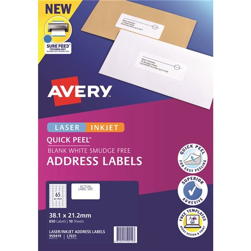 SureFeed™ technology is engineered to help provide a more reliable feed through your printer. Compatible with Laser and Inkjet printers. Address Labels have Quick Peel™ Pop-up Edge™ making peeling the label faster and easier, simply bend back the sheet and the edge pops up, just peel and apply 12-65 up. Jam-Free reliability for trouble free printing, saving time and minimising wastage. Labels use Opaque TrueBlock® technology which completely covers everything underneath. Customise your labels with Avery Design and Print, available at averyproducts.com.au/print. FSC® certified labels made with paper from well-managed forests. Made in Australia. Size: 38.1x21.2mm 650 labels, 10 Sheets. 65 labels per sheet (65UP).