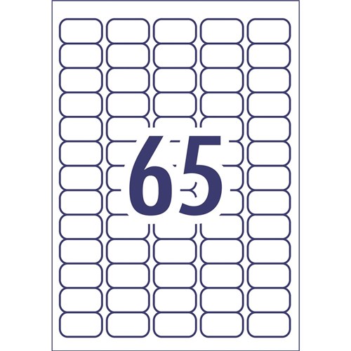 • Size: 38.1x21.2mm 650 labels, 10 Sheets. 65 labels per sheet (65UP).