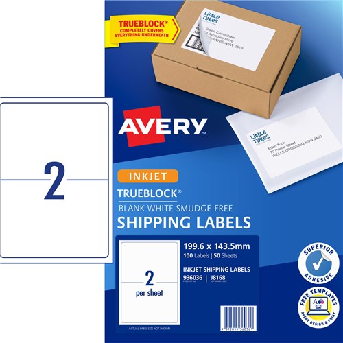 Ideal for addressing and shipping of letters parcels and boxes FSC certified labels made with paper from well managed forest Inkjet Labels guaranteed Smudge Freeâ„¢ printing on inkjet printers Supported by free Avery templates available at averyproducts com au/print Size: 199.6x143.5mm 100 labels, 50 sheets. 2 labels per sheet (2 UP)