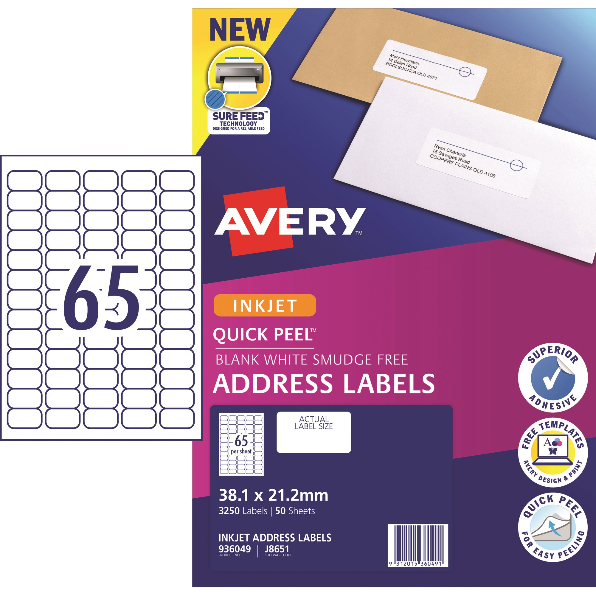 Avery Quick Peel Address Laser Inkjet Labels White J8651 38.1x21.2mm 65UP 3250 Labels