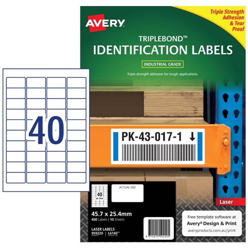 Avery TripleBond Laser Labels Identification White L6140 45.7x25.4mm 40UP 400 Labels