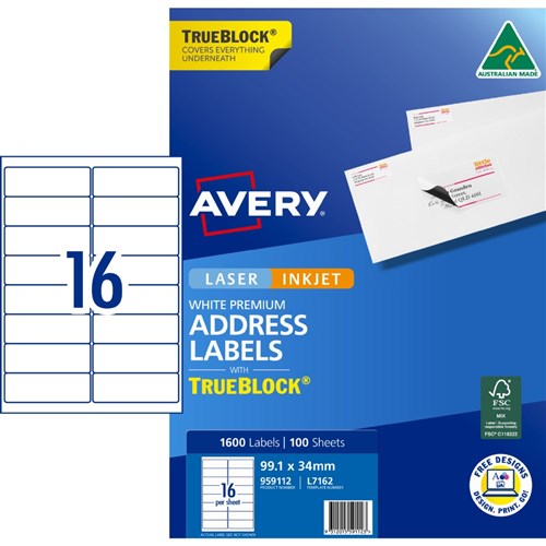 Avery Trueblock Address Labels Laser L7162 99.1 x 34mm 16UP 1600 Labels