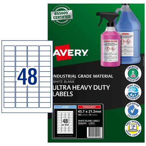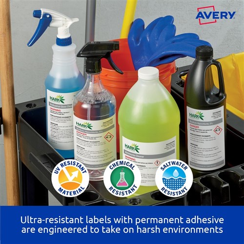 Ultra-Resistant Labels are saltwater resistant and certified for GHS Chemical Labelling with permanent adhesive and engineered to take on harsh environments. Unaffected by temperature variations -40?C to +150?C. Ideal for chemical labelling requirements and for onsite chemical decanting. Used in marine and harsh environments, ideal for safety signs, arc flash and tanks. Customise your labels with Avery Design and Print, available at averyproducts.com.au/print. Size: 45.7x21.2mm 480 labels, 10 sheets. 48 labels per sheet (48UP).