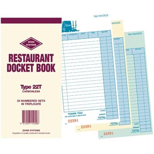 • Zions offers a wide range of single, duplicate, triplicate and quadruplicate restaurant docket books, suitable for all styles of bistros, cafes, restaurants and take-away outlets.
