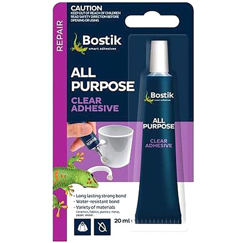 All purpose adhesive, water resistant adhesive for assembly and repair needs. Extra strong, long lasting bond, water resistant. Suitable for use on metals, wood, glass, china, leather, felt, canvas, vinyl, paper and cardboard, certain fabrics and PVC.
