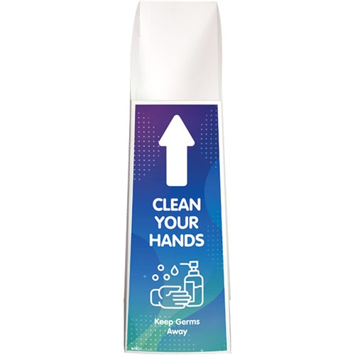Light weight and portable. Printed illustration to direct people to hand sanitiser and promote good hand hygiene. Can be customised, add your logo for identification. Stand fits various hand sanitiser pump bottles from 500ml up to 5 litres. Integrated bottle neck tag to secure hand sanitiser to stand. Supplied in flat pack but simple to assemble and no tools required. Hand Sanitiser not included.