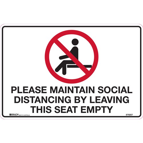 Wording: Please Maintain Social Distancing By Leaving This Seat Empty. Colour: White, red and black. Material: Polypropylene. Complies to Australian Standard AS1319-1994. Prohibition signs specify behaviour or actions which are not permitted. Commonly found in offices, shopping centres and high traffic locations where specific actions could be potentially dangerous. Assists in communicating a message where there may be a worker or visitor with a language barrier. Size: 300W x 225mmH.