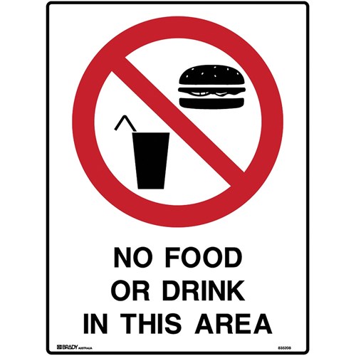 Brady Prohibition Sign No Food Or Drink In This Area 450W x 600mmH Metal White/Red/Black