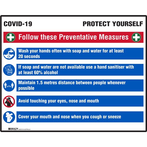 Brady Safety Sign Covid-19 Prevention Multi-Message 900W x 600mmH Poly White/Blue