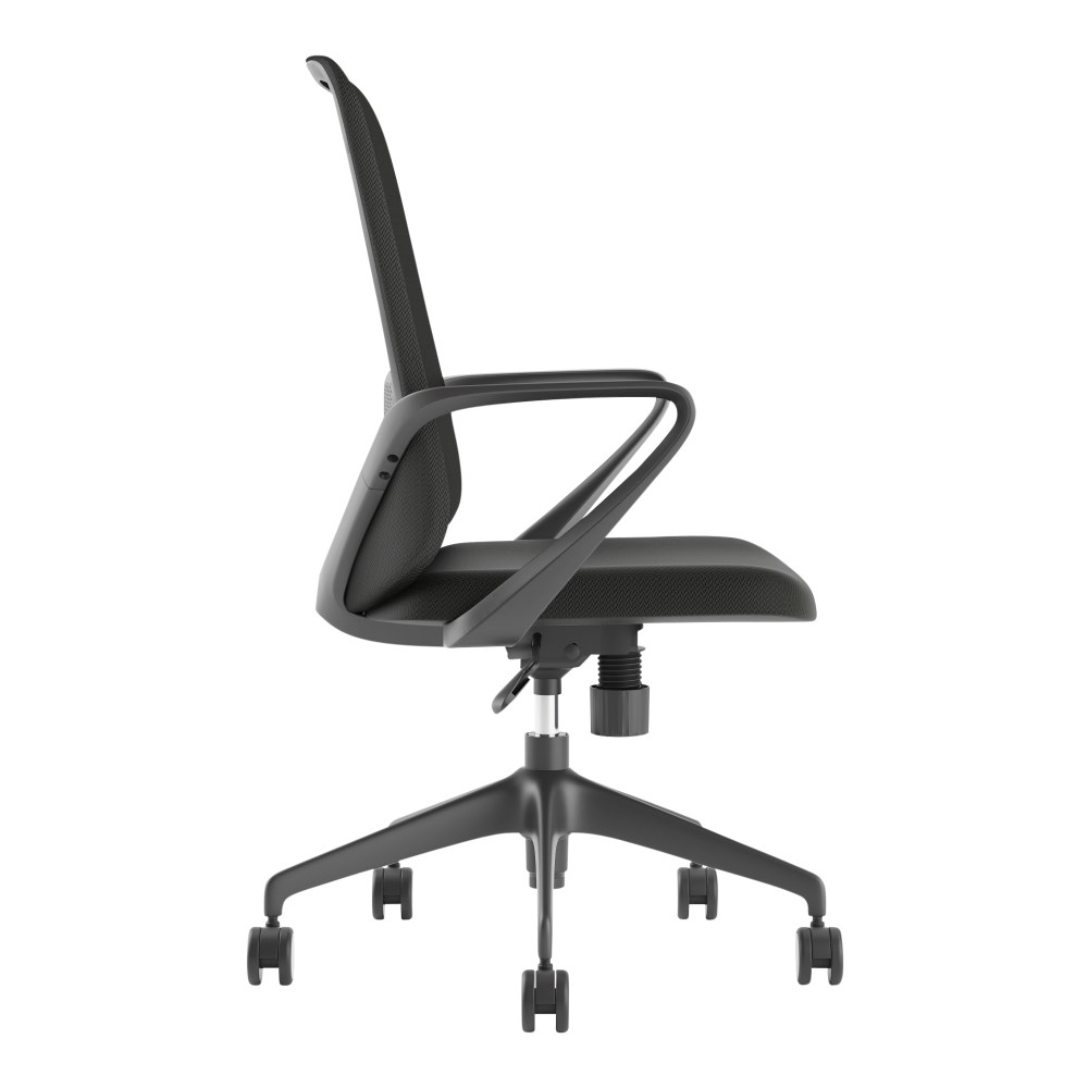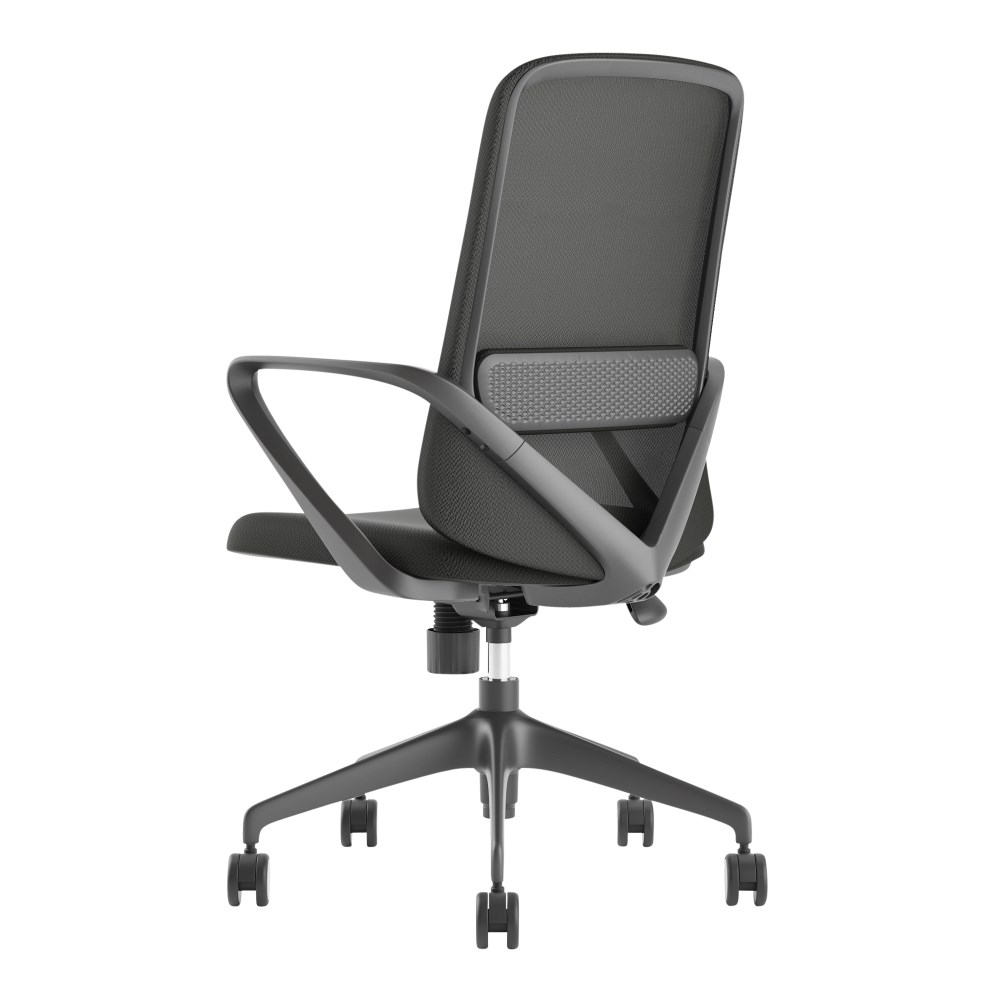 • Composition: Mesh back with lumbar support, upholstered seat and strong nylon 5 star base with 60mm nylon castors. Fixed looped armrests.