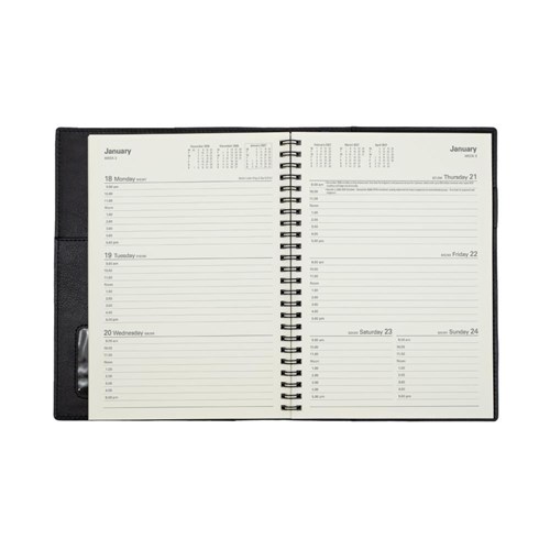 Ideal for those 'on the move' with its double wiro binding and heavily grained metallic and matt PU cover. Has a removable jacket sleeve, pen loop and internal storage pockets. Hourly appointment times. Monthly planners, staff leave and financial summary. 3 year calendars. Addresses and notes. Australian and New Zealand holidays. Current and forward year planners. Tax information.