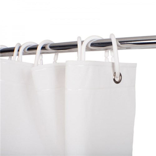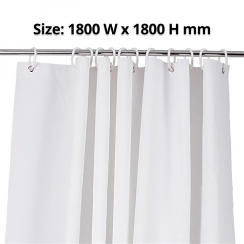 PEVA non-chlorinated vinyl material. 12 plastic rings included for 12 eyelets. Plain finish (no pattern on material). Water resistant and water repellent. Light weighted base. Warm machine washable, remove rings. Rinse well, line dry in shade recommended. Cleaning with strong cleaning chemicals not recommended. Dimensions: 1800W x 1800mmH.