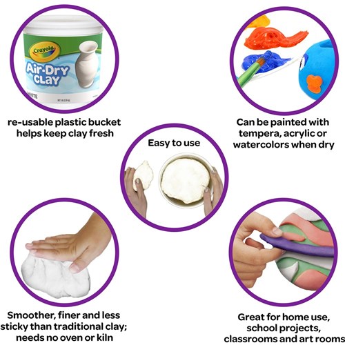 Snap to clean up. Easy to use with traditional modelling techniques. Easy to use clay moulds with water. Air-dry clay is smoother, finer and less sticky than traditional clay. Dry pieces can be painted or varnished. Ideal for teaching basic sculpting techniques. Add a splash of color with Crayola paints.