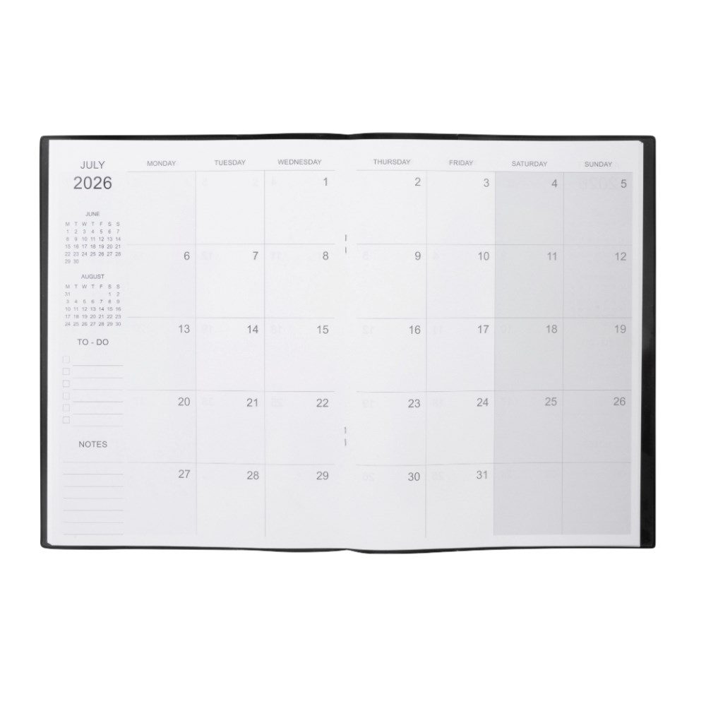 Casebound diary with current year embossed in PVC cover and all-round border stitching. Month to view layout planner to keep track of appointments, meetings, and other important events. No appointment times. FSC Certified.