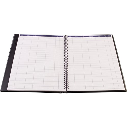 Wiro bound corporate visitors book with padded PVC cover, 64 sheets and pen loop. Lies flat when open. PVC wiro bound. Layout includes: date, name, car registration, representing, to see, time in & time out.