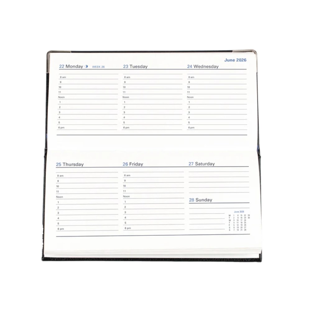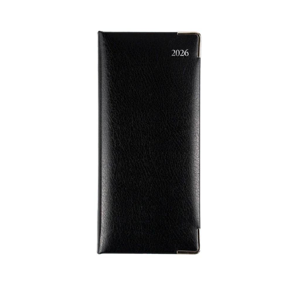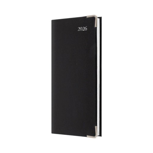 Bound in black bonded leather with silver corners and page edging. Appointment times from 8am - 6pm hourly. Landscape. Ribbon marker. Australian and New Zealand Holidays. Lay flat opening. Tabs. Size: 176 x 88mm. FSC Certified.