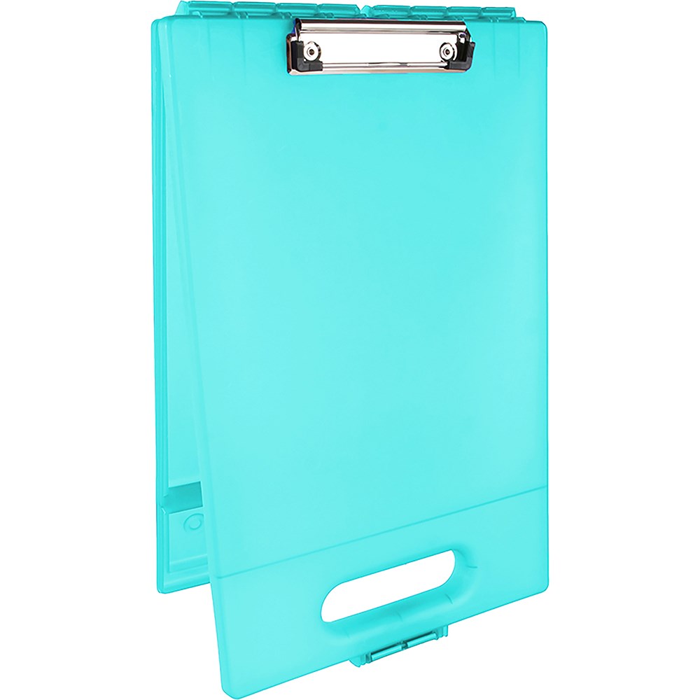 Holds A4 paper and letter size files, forms, and pads. Use at school on the job or at home. High impact - break-resistant, tough, durable, light-weight. Steel clip holds papers securely in place. Holds pens, papers, accessories and more. Aqua.