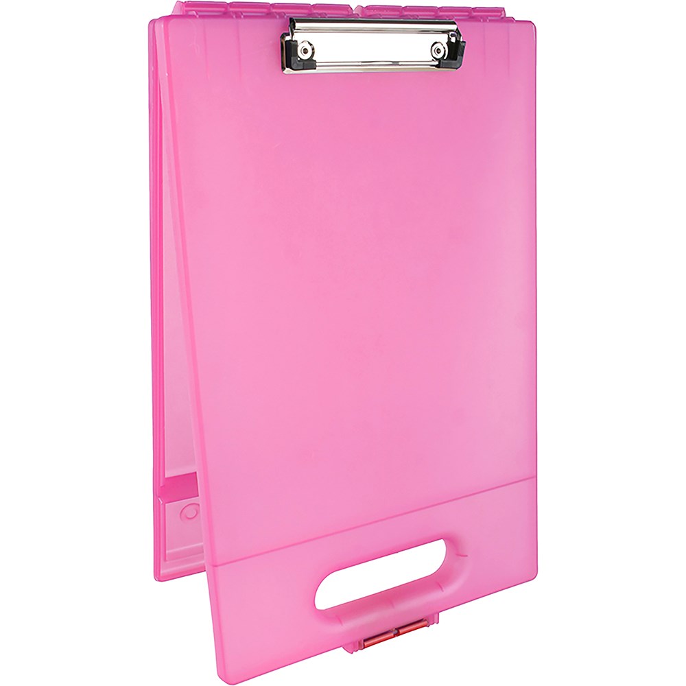 Holds A4 paper and letter size files, forms, and pads. Use at school on the job or at home. High impact - break-resistant, tough, durable, light-weight. Steel clip holds papers securely in place. Holds pens, papers, accessories and more. Pink.