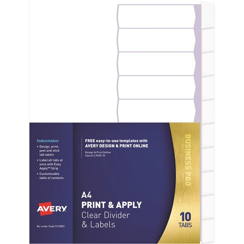 Avery L7455-10 Print & Apply Label Dividers A4 10 Tabs Clear