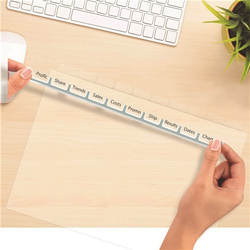 Translucent clear tab labels virtually disappear behind text. Organise your documents quickly and easily. Simply print, align labels against tabs, smooth down labels and peel up strip.