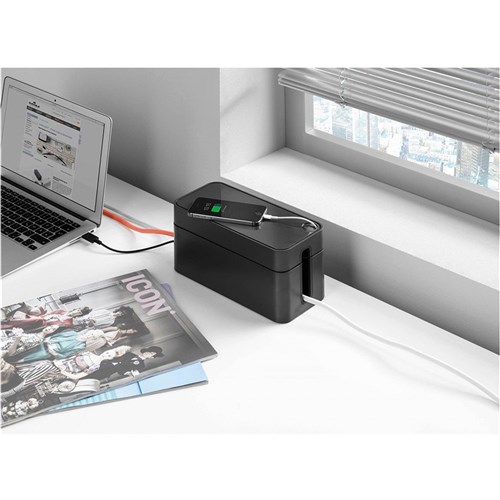 Elegant cable box to hold cables and 3-socket strip Double-sided rubberised cable outlet slots for easy handling and ideal air circulation Cover with practical, circular cable opening for mobile phone charging cable High-quality, flame-retardant plastic Large rubber pads for non-slip stability Dimensions: 246W x 238D x 116mmH.