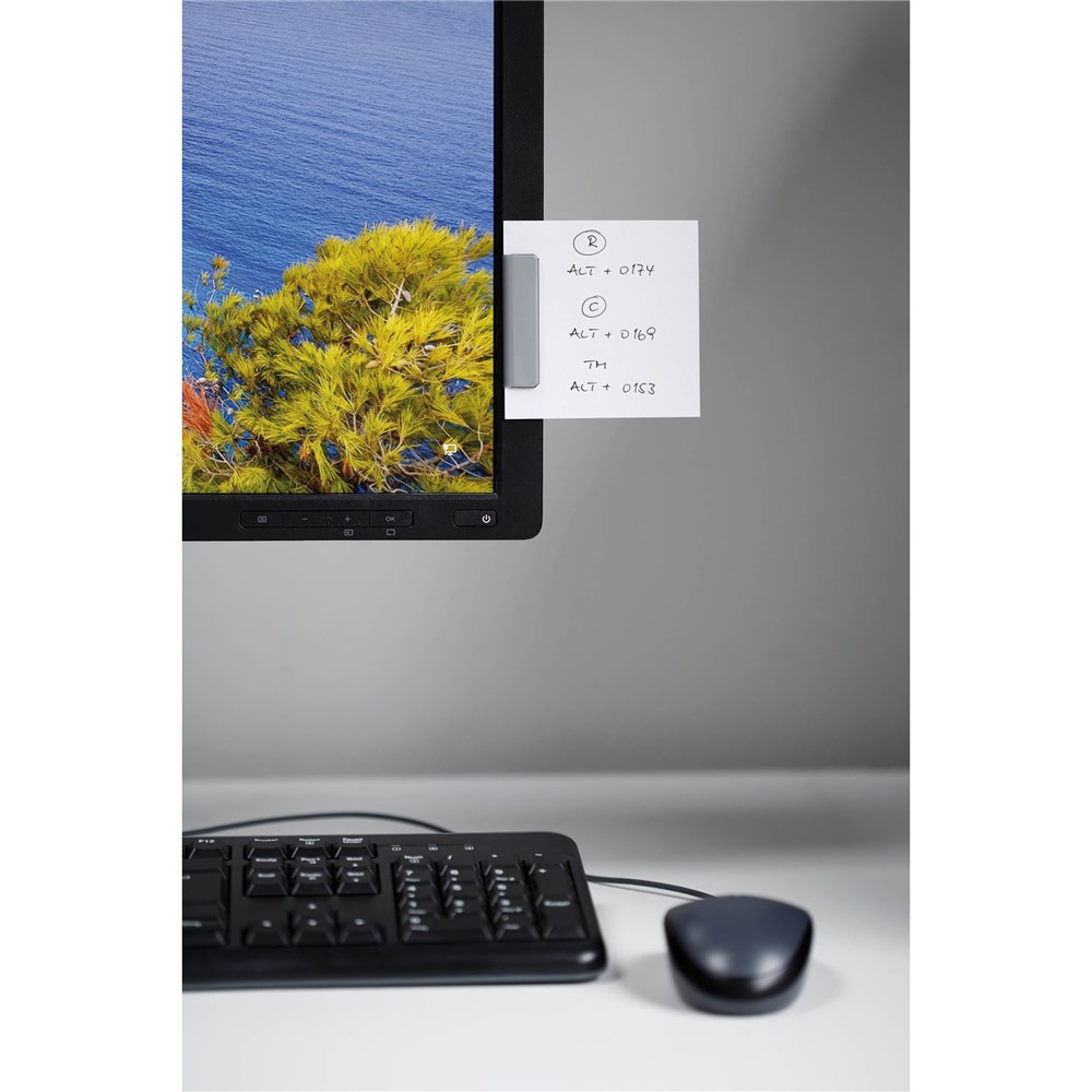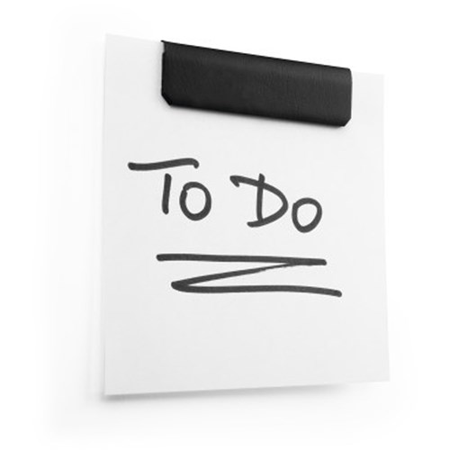 Magnetic clip for notes, reminders and appointments etc. Self-adhesive attachment on smooth, attachable surfaces such as cabinets, fridges, glass doors or showcases. Residue-free removal from smooth, attachable surfaces. Attachment of clip on side or top of document depending on space needs.