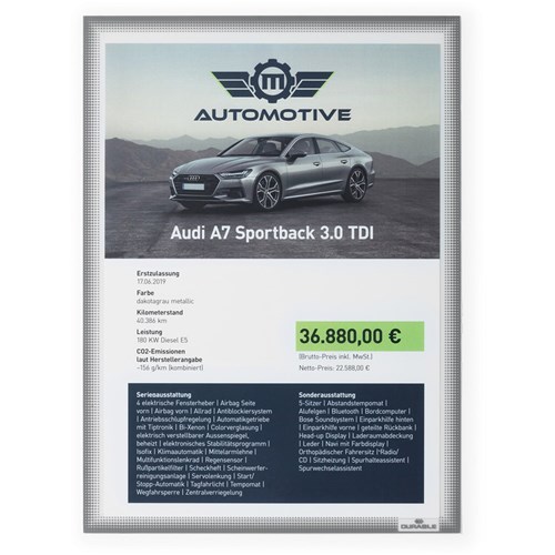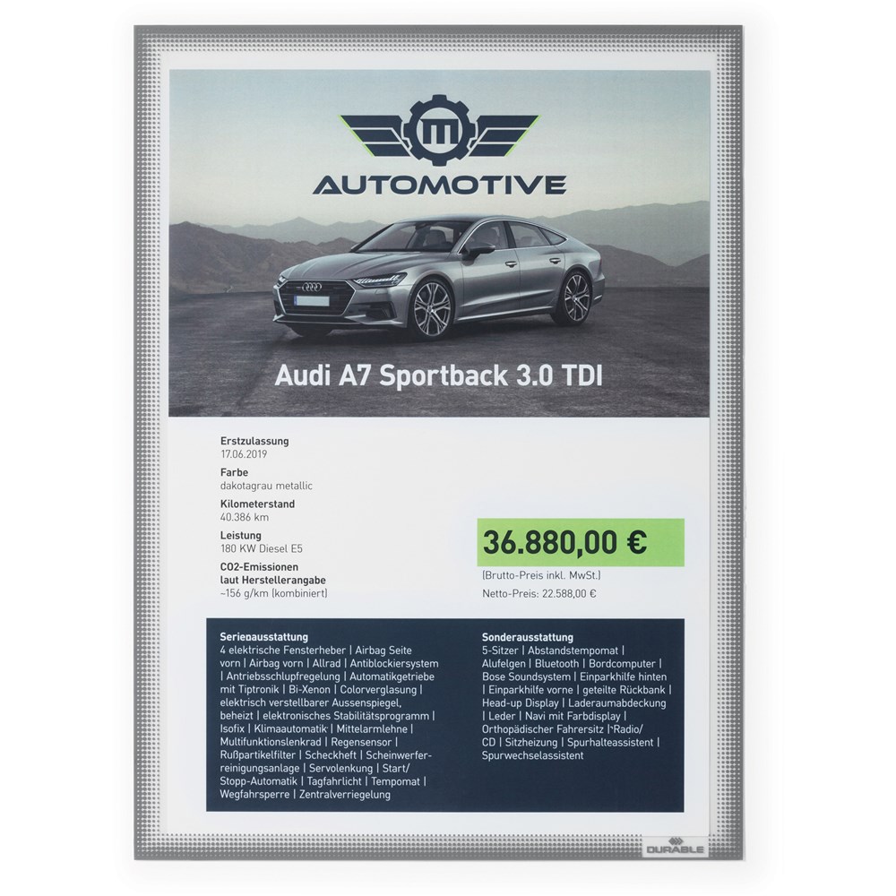 • Adhesive free, static cling pocket for curved glass surfaces such as car windows, shop windows and sales counters.