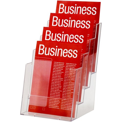 High quality brochure holder. Moulded for strength and durability. 4 tier brochure holder. 4 compartments. Great for displaying brochures and pamphlets. Free standing. A5 size.