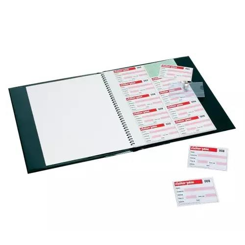 Wiro bound corporate visitors book with padded PVC cover, 64 sheets and pen loop. Lies flat when open. PVC wiro bound. Layout includes: date, name, car registration, representing, to see, time in & time out.
