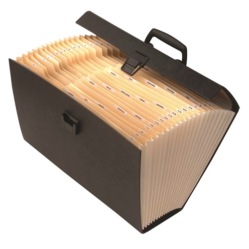 Features carry handle and latch for easy transportation. Comes with a range of pre-printed A-Z, business, school and home office subject tabs. 19 pocket storage. Dimensions: 390W x 130mmL x 250mmH.