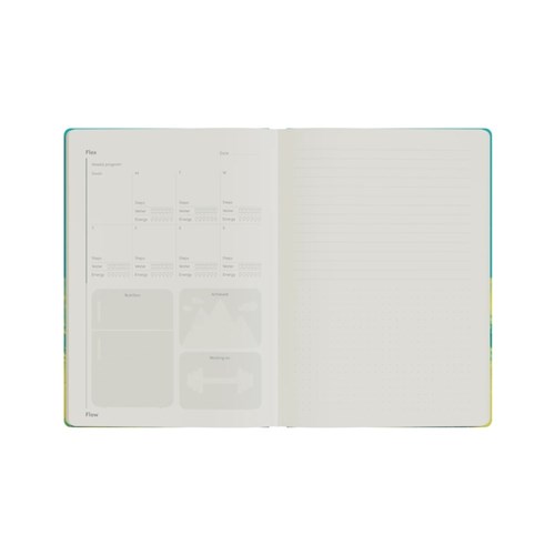 Note pages. Elastic closure. Ribbon marker. 100% recycled paper. Left: Weekly affirmations and challenges. Right: Top ruled, bottom dot grid.