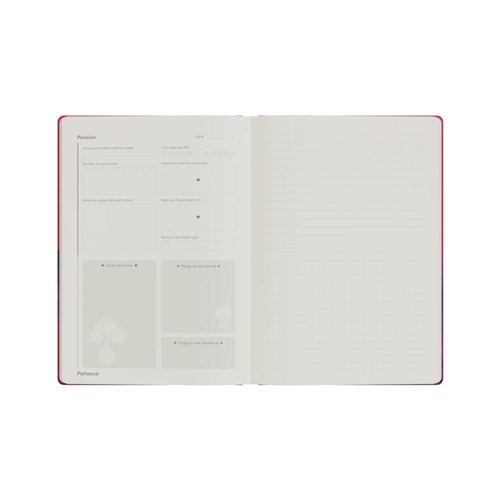 Note pages. Elastic closure. Ribbon marker. 100% recycled paper. Left: Weekly affirmations and challenges. Right: Top ruled, bottom dot grid.