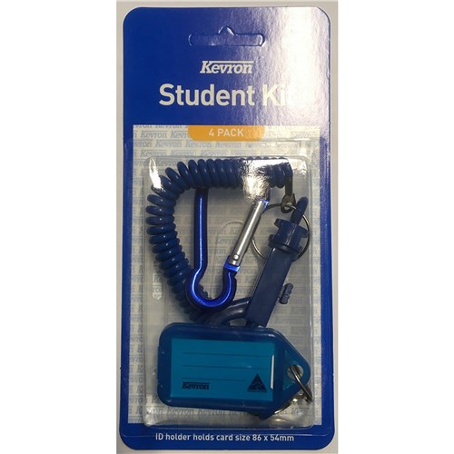 The Kevron student kit 4 piece pack is a comprehensive kit for Id cards and proximity cards. Pack includes: 1 Heavy duty Id card holder for Id card or travel card protection. 1 x Expanding coil with multiple uses. 1 x Carabineer with multiple uses. Perfect for everyday use. Durable and easy opening clicktags with pre-cut paper insert. Blue pack contents.