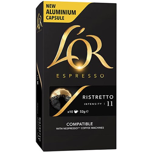 Aluminium capsules which are compatible for use with your Nespresso machine. Intensity 11. Delivers a more intense espresso experience and a richer and smoother foam compared to the existing LOR Espresso plastic capsules. Delivered as 10 boxes of 10.