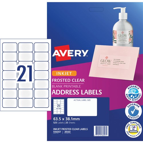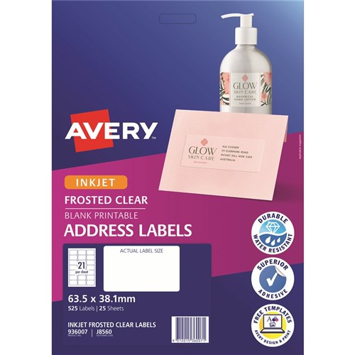 Avery Frosted Clear Inkjet Address Labels J8560 63.5x38.1mm 21UP 525 Labels